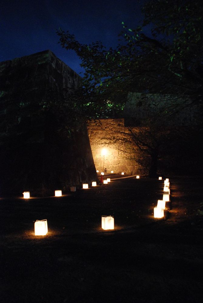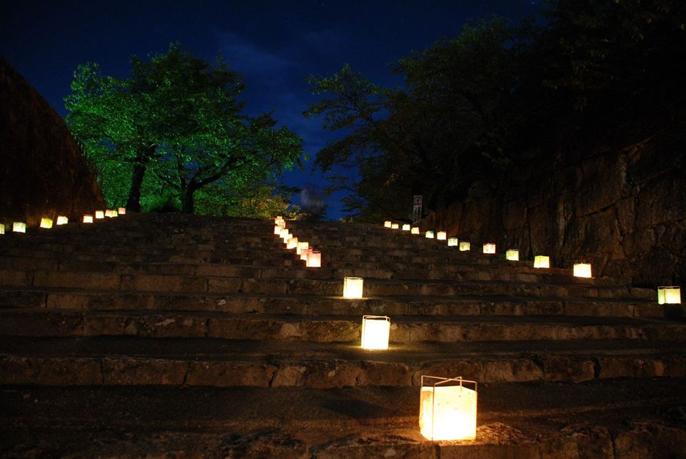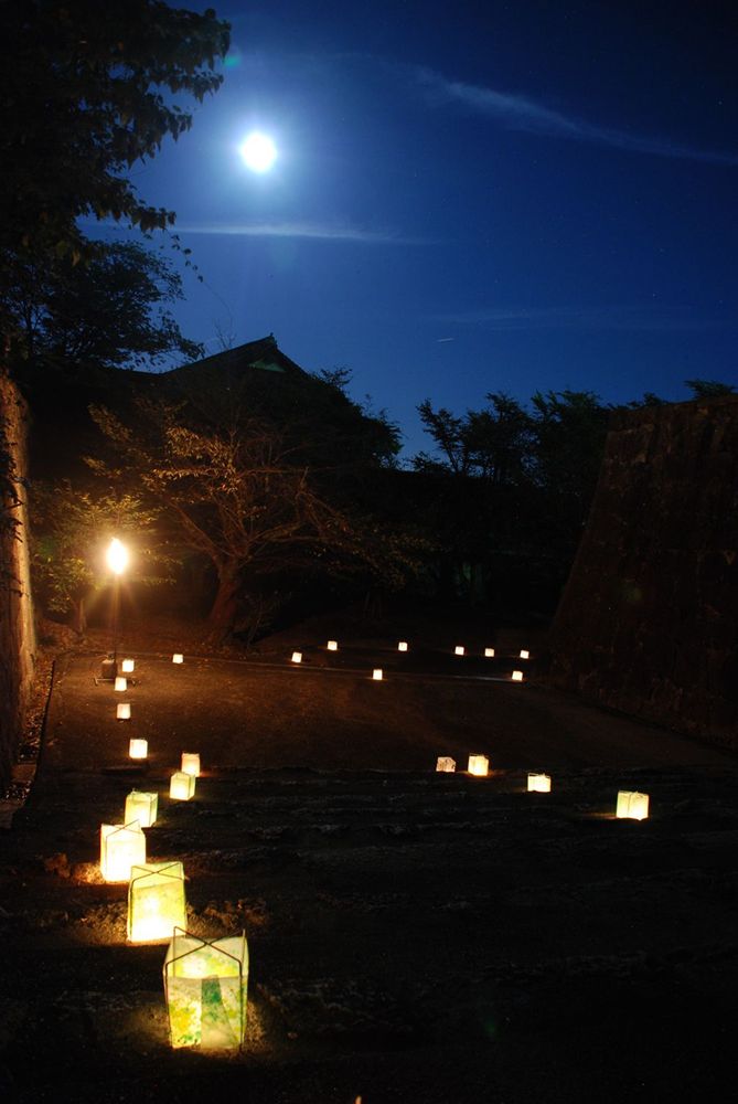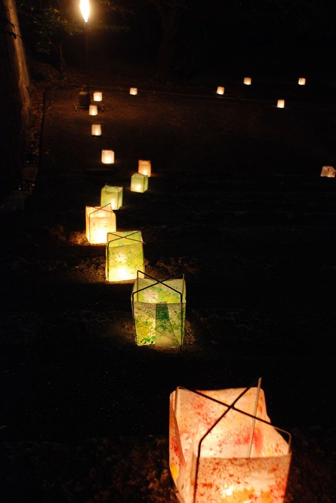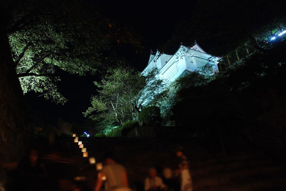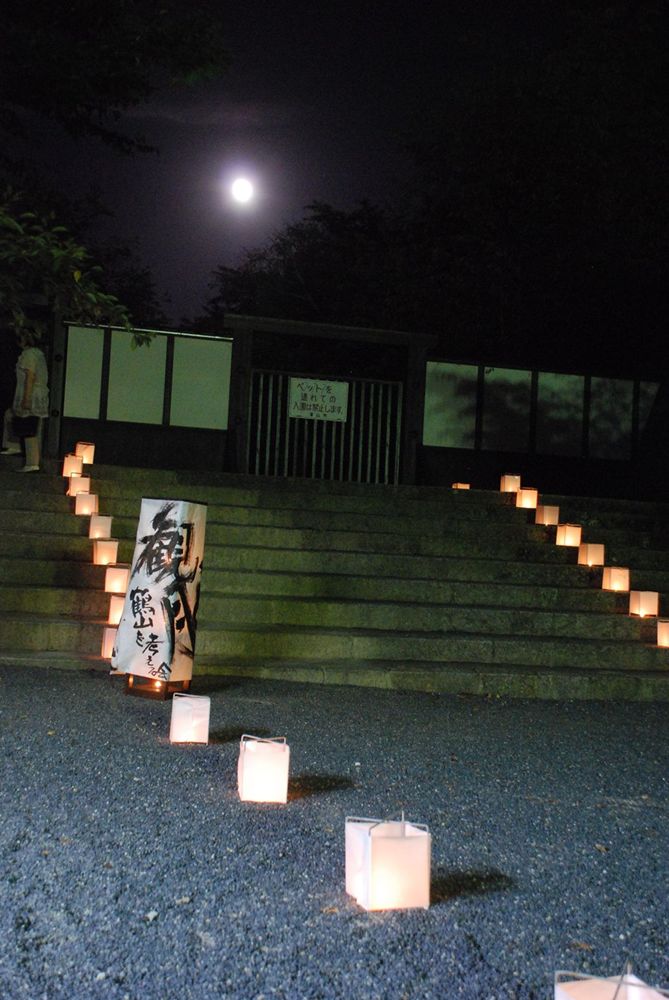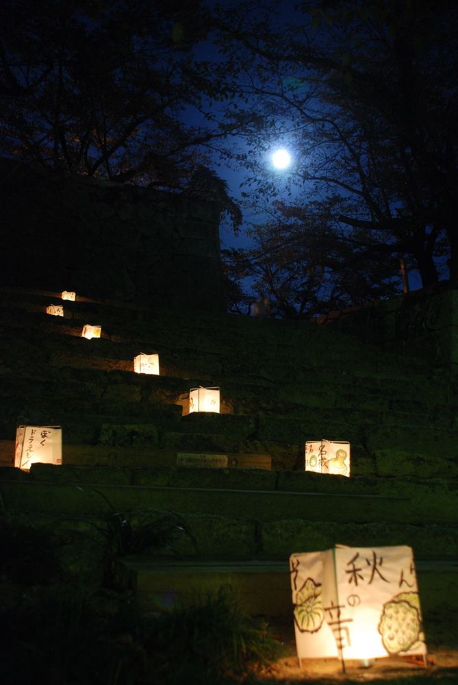 津山市の鶴山公園(津山市山下)で12日夜、「第13回 観月と邦楽の夕べ」が開かれました。公園入り口から手作り灯籠の淡い灯りに導かれ会場までを演出。綺麗に浮かび上がる仲秋の名月とライトアップされた備中櫓前で約800名以上の方々が邦楽の音色を堪能されました。(2011年9月12日)
