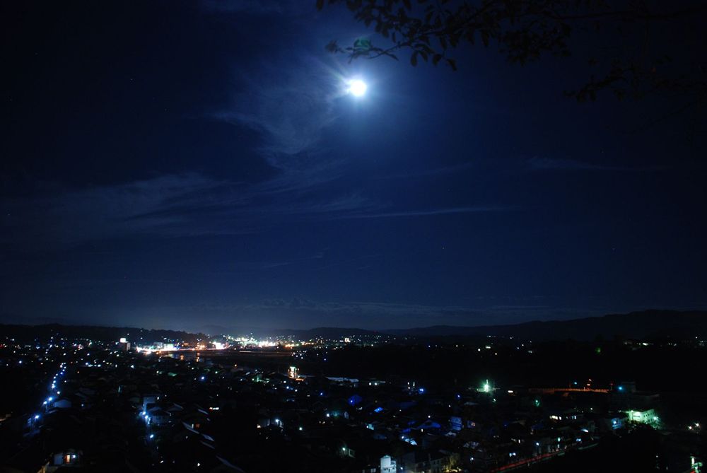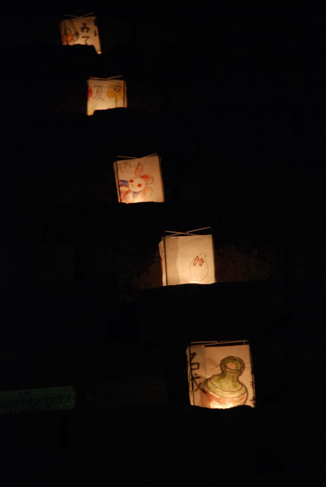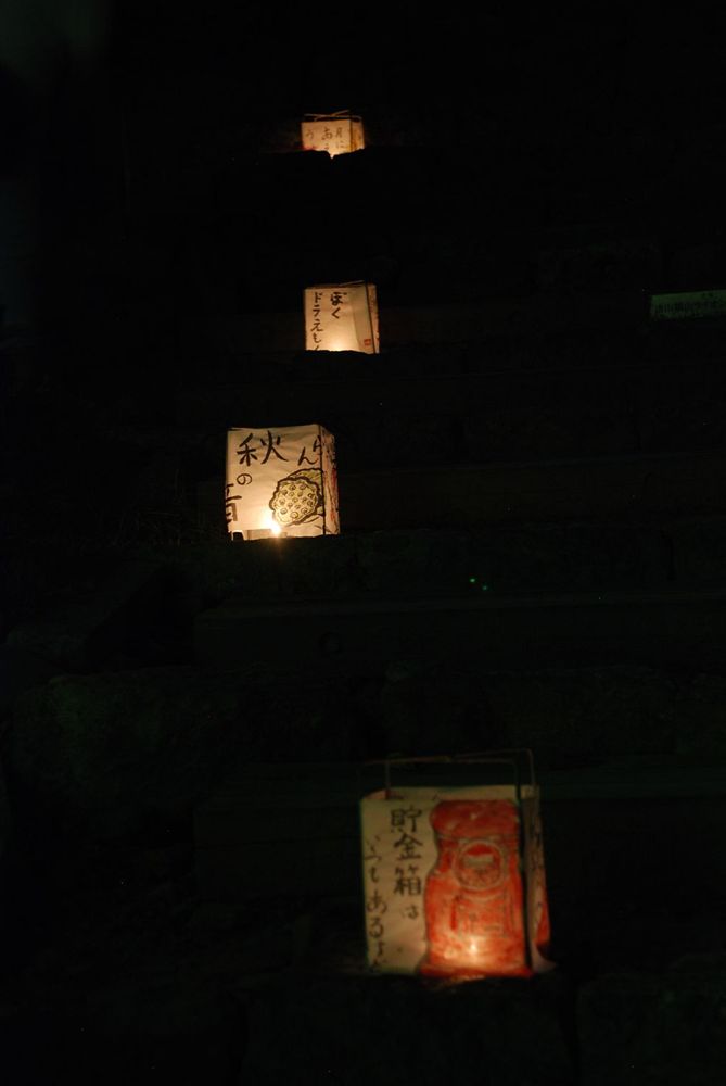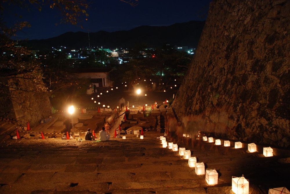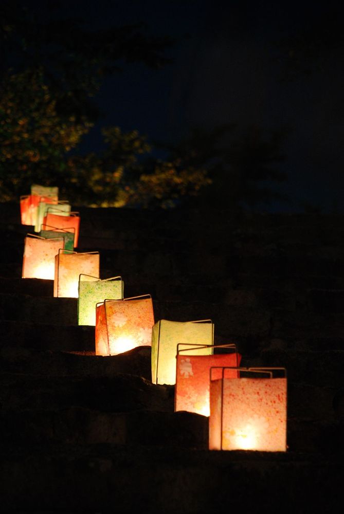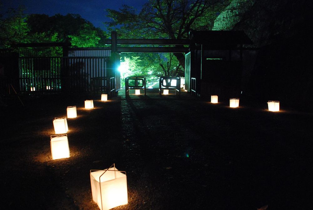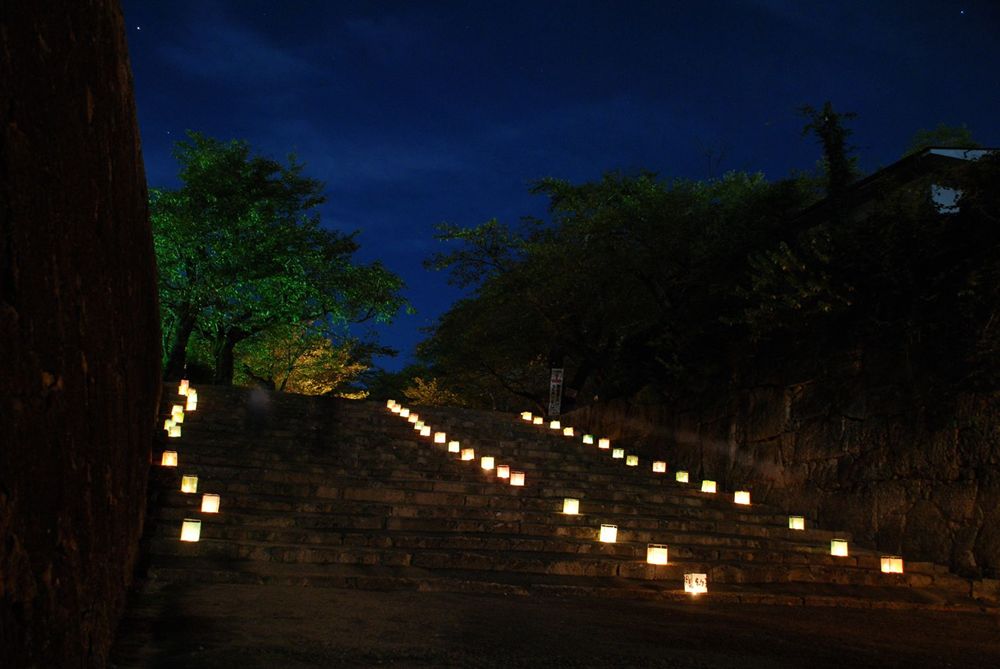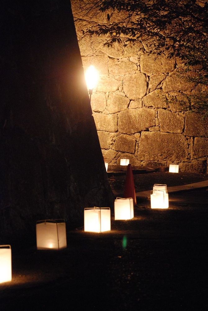津山市の鶴山公園(津山市山下)で12日夜、「第13回 観月と邦楽の夕べ」が開かれました。公園入り口から手作り灯籠の淡い灯りに導かれ会場までを演出。綺麗に浮かび上がる仲秋の名月とライトアップされた備中櫓前で約800名以上の方々が邦楽の音色を堪能されました。(2011年9月12日)