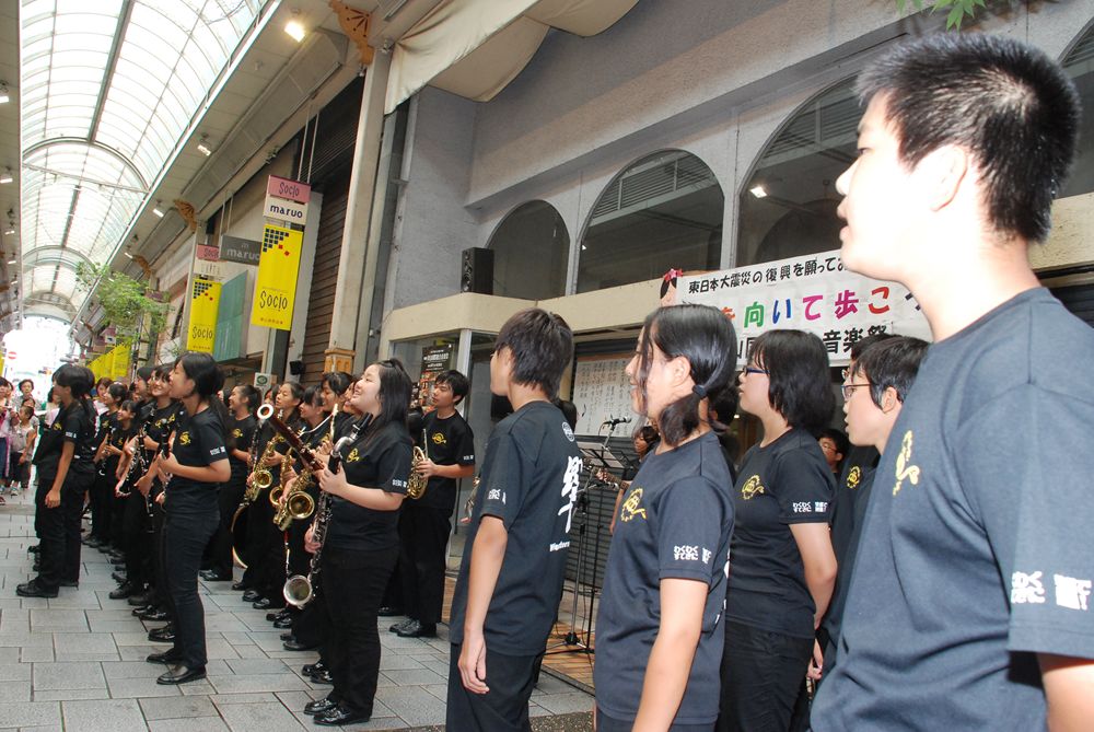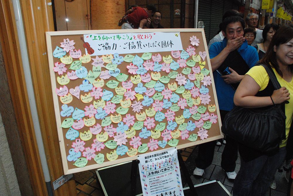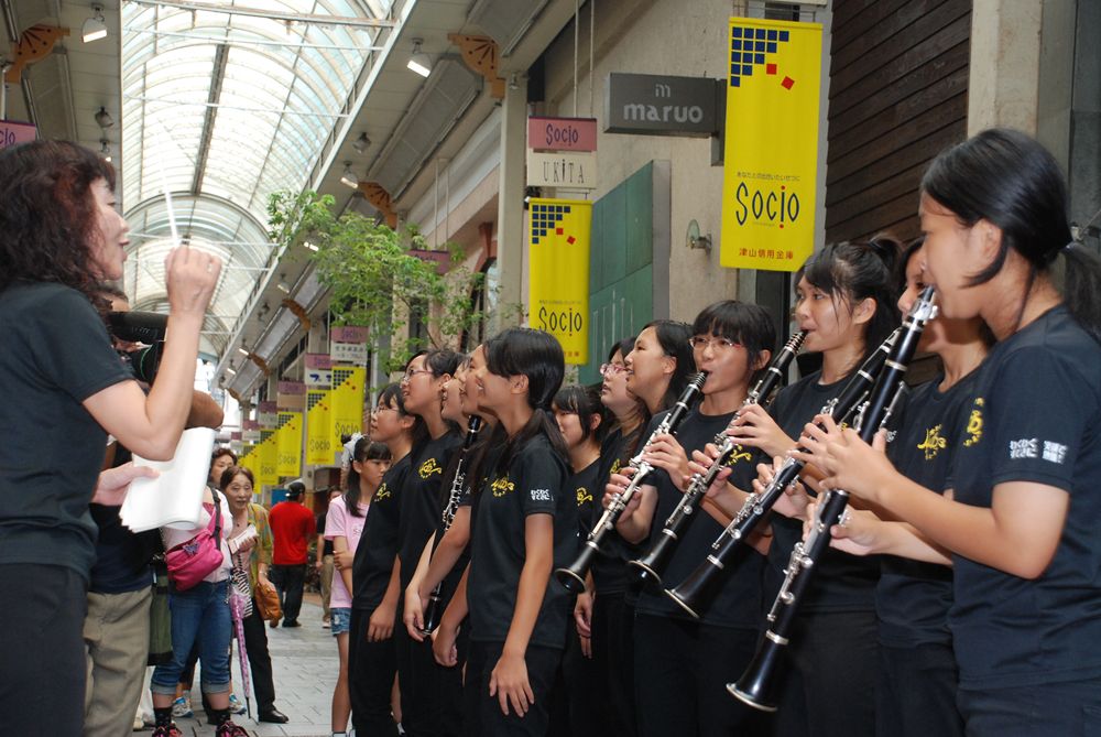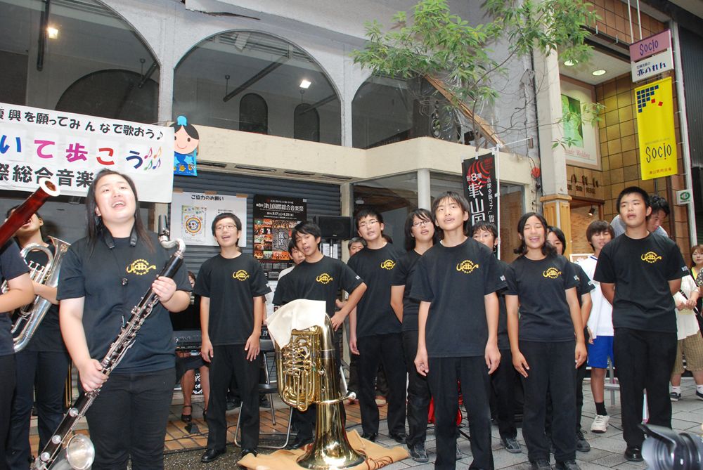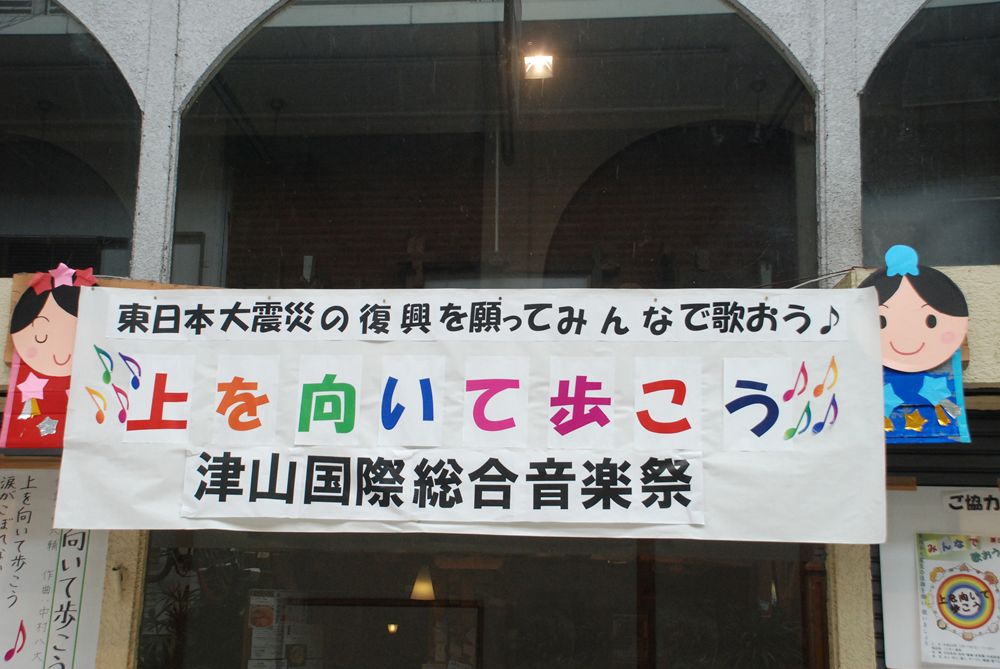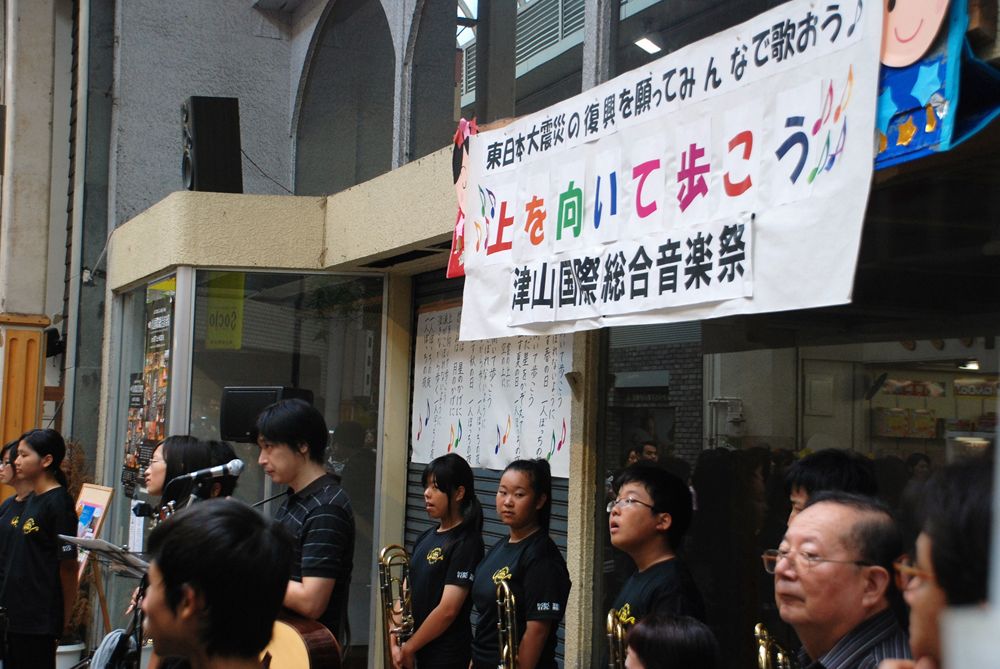 第8回津山国際総合音楽祭の開幕初日、津山市商店街ソシオ一番街にて市民が一斉に「上を向いて歩こう」を合唱しました。コミュニティーFM局「エフエムつやま」で生放送され、たくさんの歌声が輪となり東日本大震災の被災地へ力強い応援メッセージを送りました。