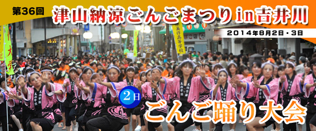 津山市恒例の夏イベント「津山納涼ごんごまつり」、その初日となる2日「ごんご踊り」では32団体の踊り連が、さまざまなパフォーマンスを繰り広げながら踊りを披露されました。(2014年8月2日)