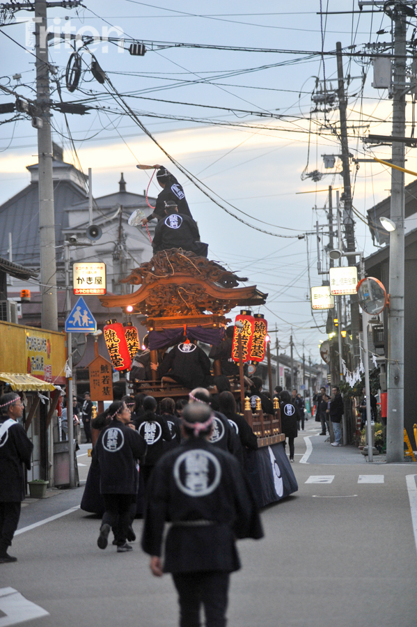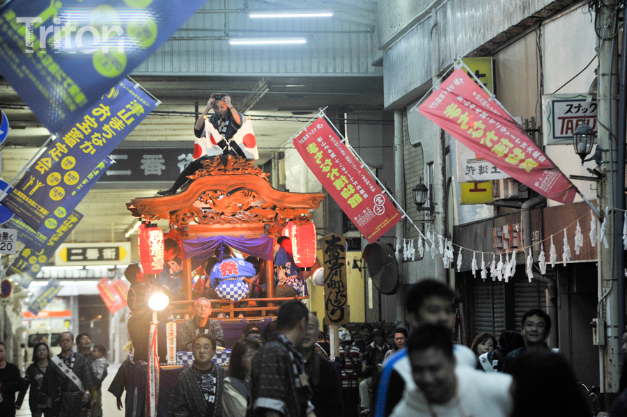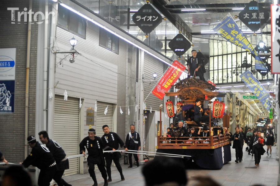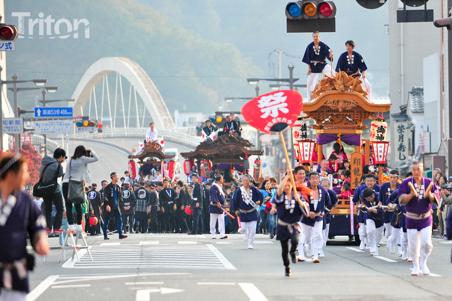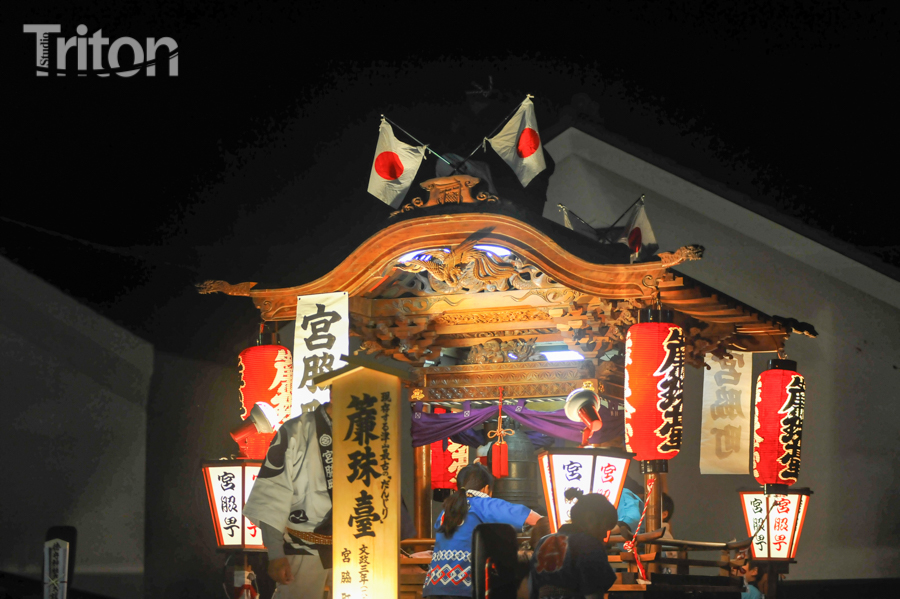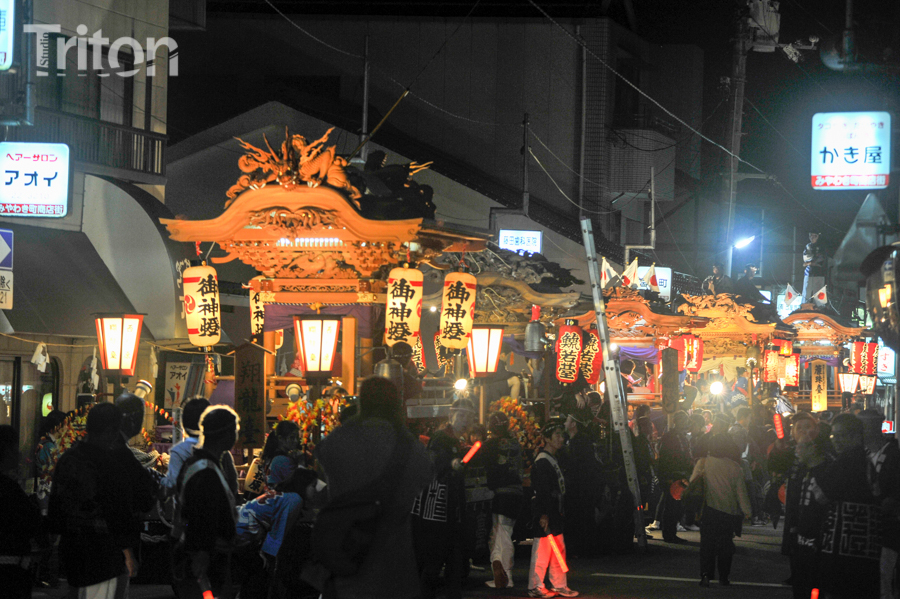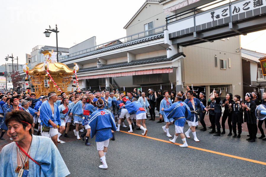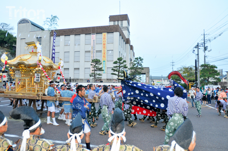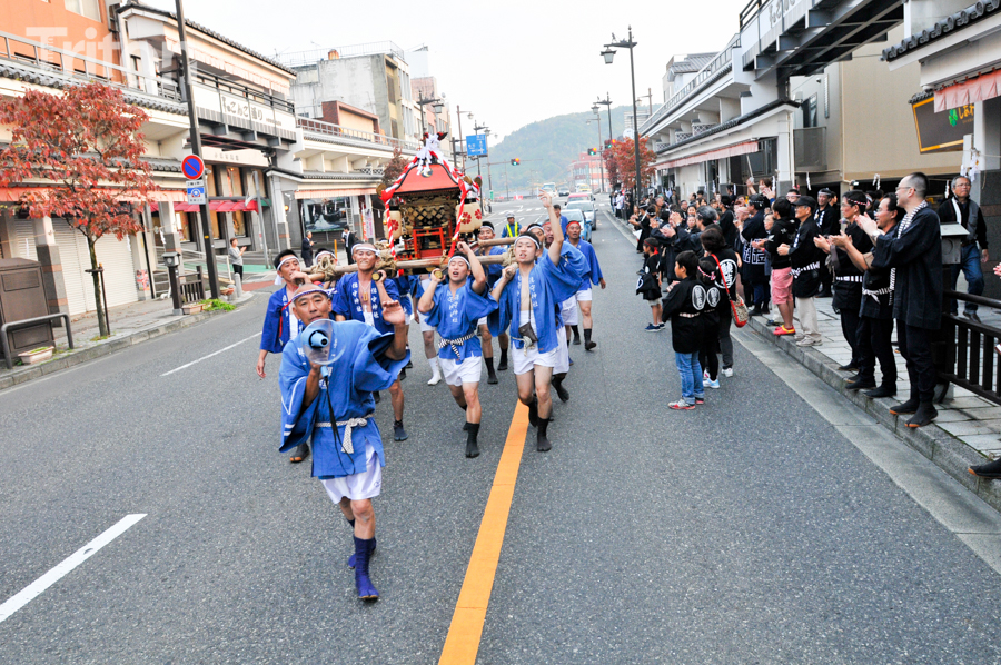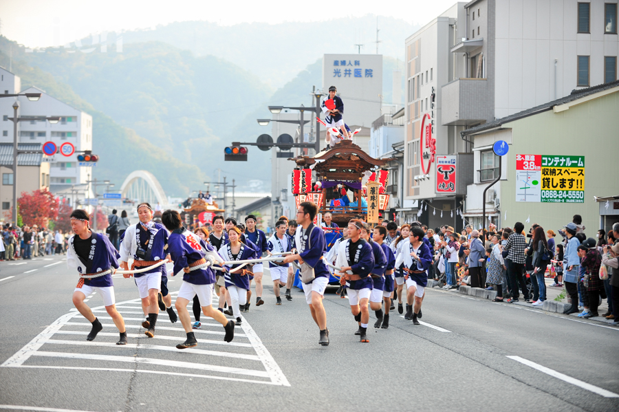 「津山まつり」最終日となる26日、総鎮守徳守神社(同市宮脇町)の秋祭りが行われた。その前夜となる宵祭り(25日)には出動だんじりが宮脇町通りに集結し、夜の城下町を幻想的な灯りで彩った。今年は県重要有形民俗文化財だんじりを含む計6台のだんじりが市街地を勇壮に巡行。そして日本三大神輿の一つと言われる徳守神社神輿の壮麗な姿に大勢の市民や観光客らが拍手と歓声を上げた。(2014年10月26日)