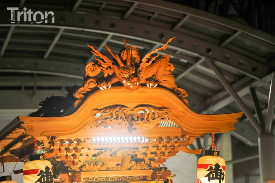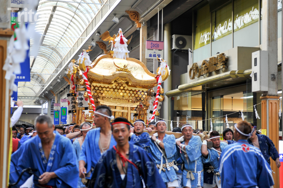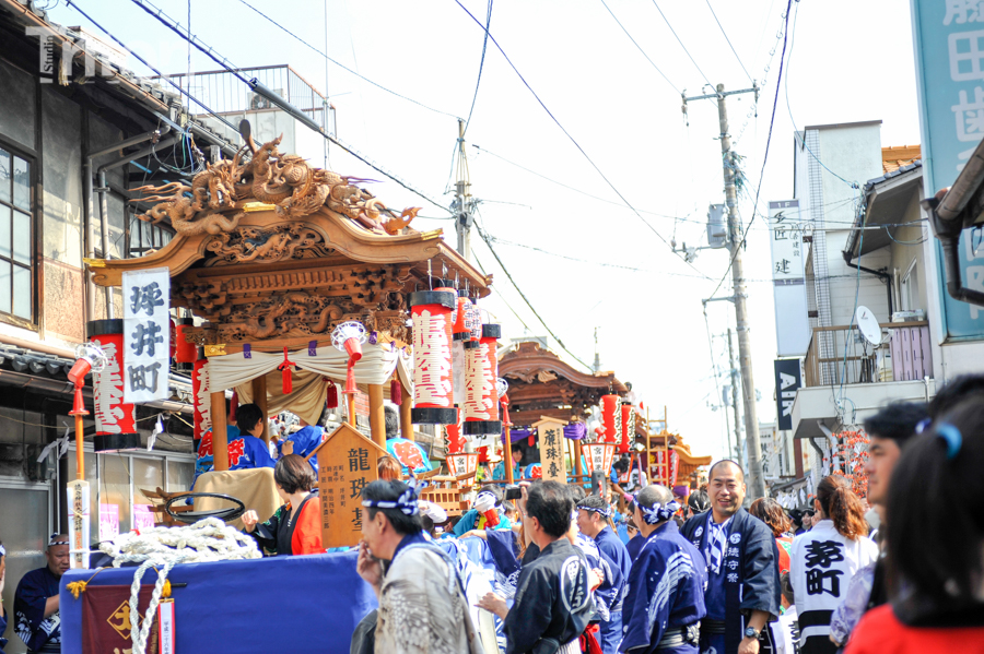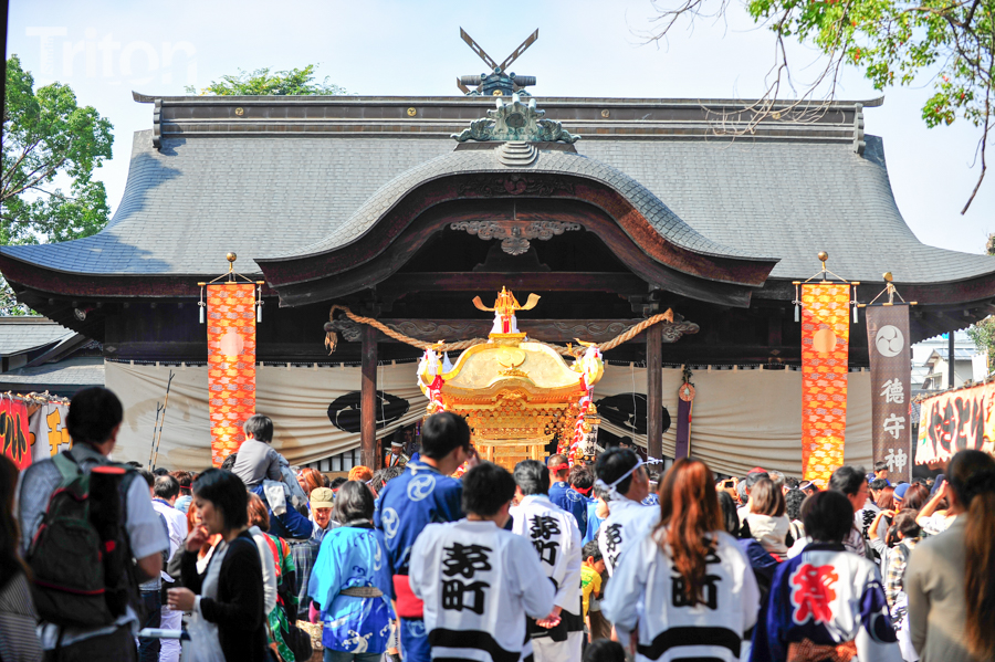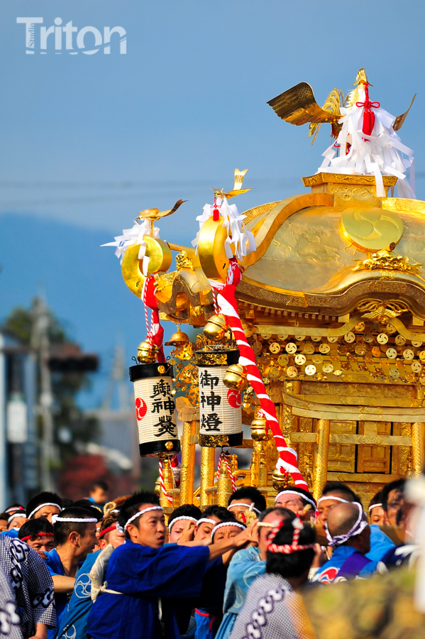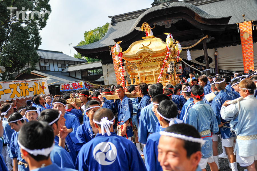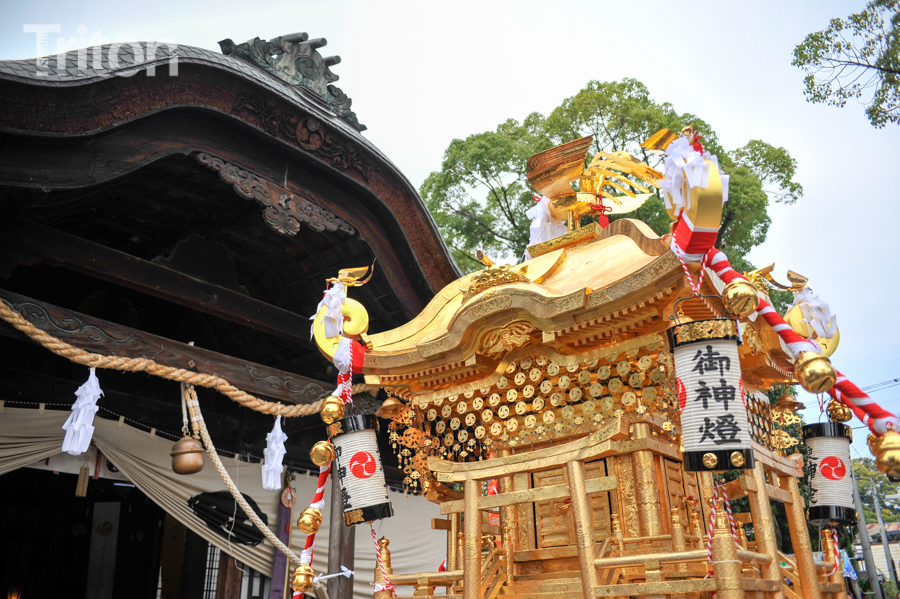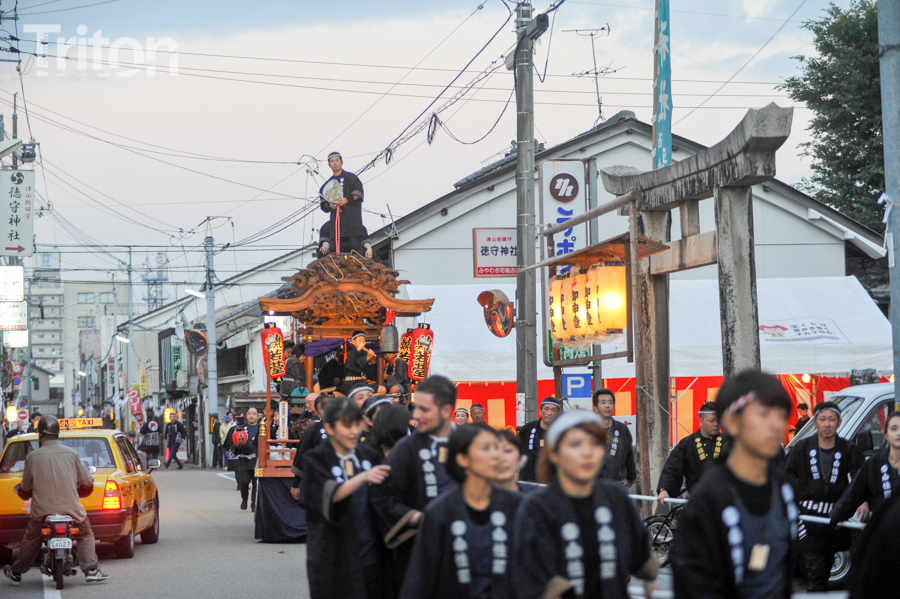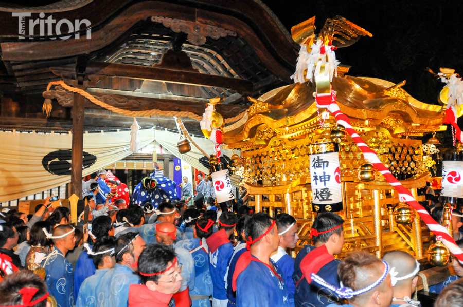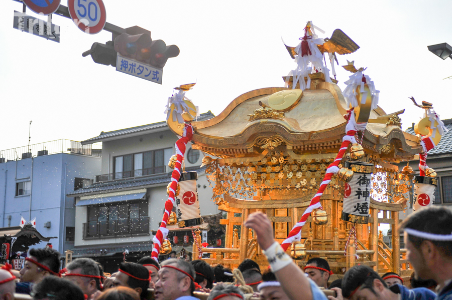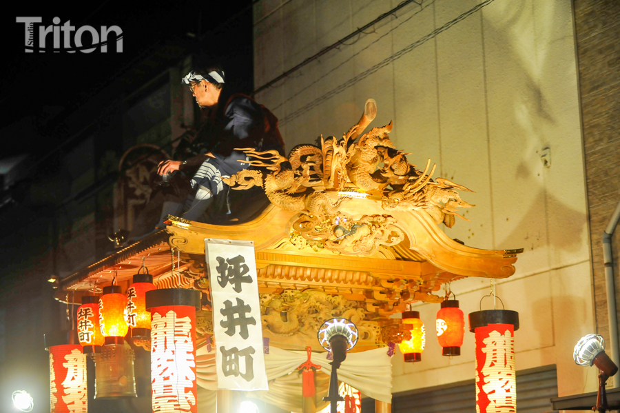 「津山まつり」最終日となる26日、総鎮守徳守神社(同市宮脇町)の秋祭りが行われた。その前夜となる宵祭り(25日)には出動だんじりが宮脇町通りに集結し、夜の城下町を幻想的な灯りで彩った。今年は県重要有形民俗文化財だんじりを含む計6台のだんじりが市街地を勇壮に巡行。そして日本三大神輿の一つと言われる徳守神社神輿の壮麗な姿に大勢の市民や観光客らが拍手と歓声を上げた。(2014年10月26日)