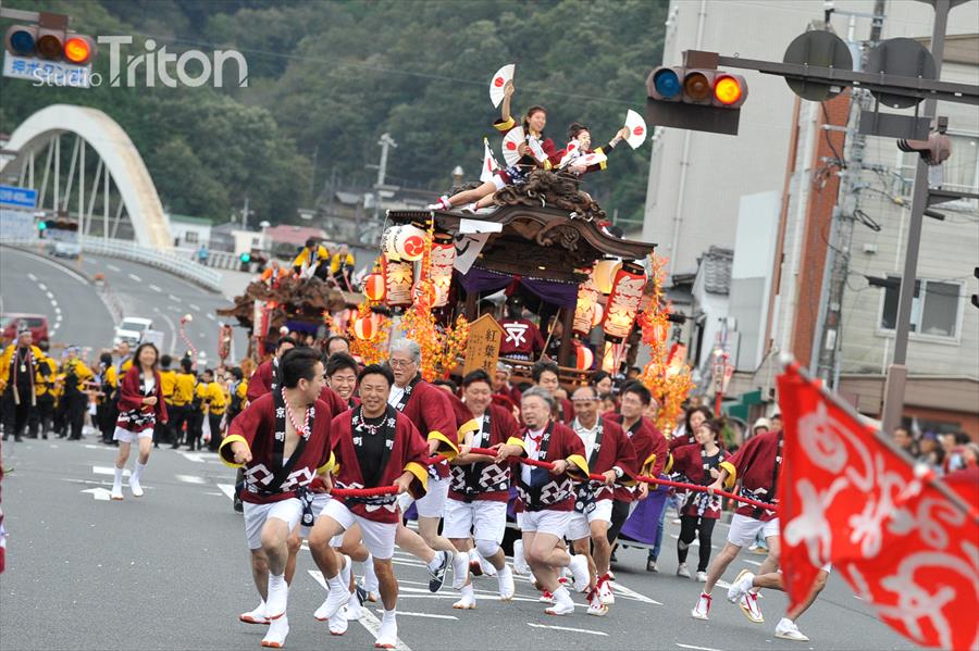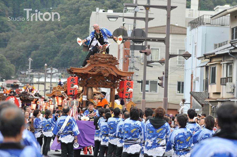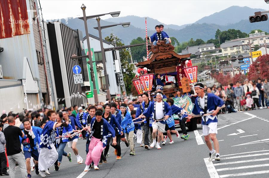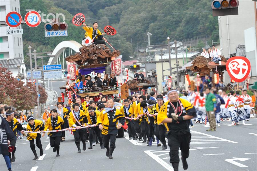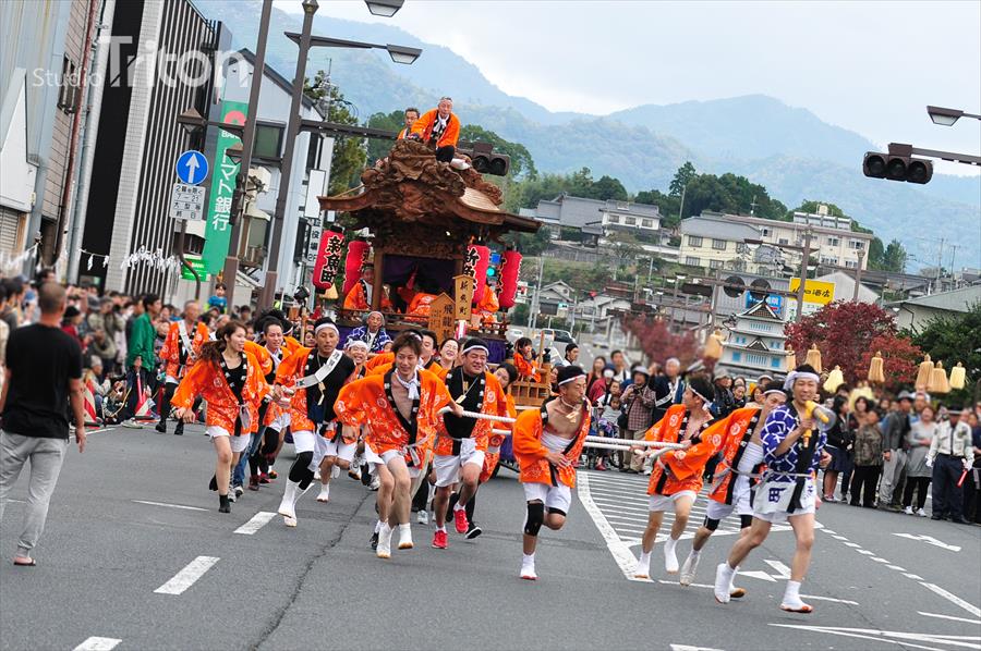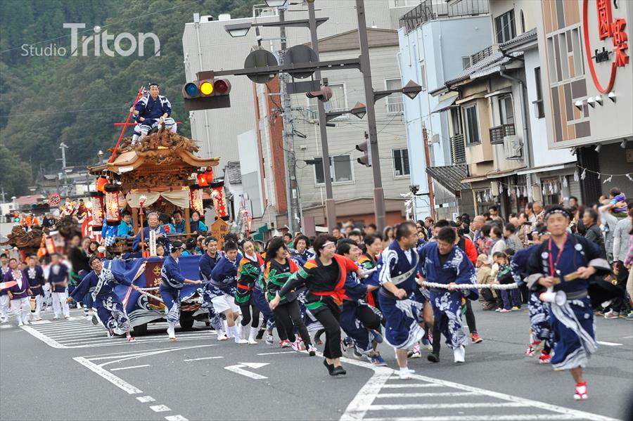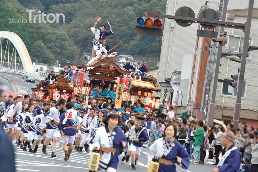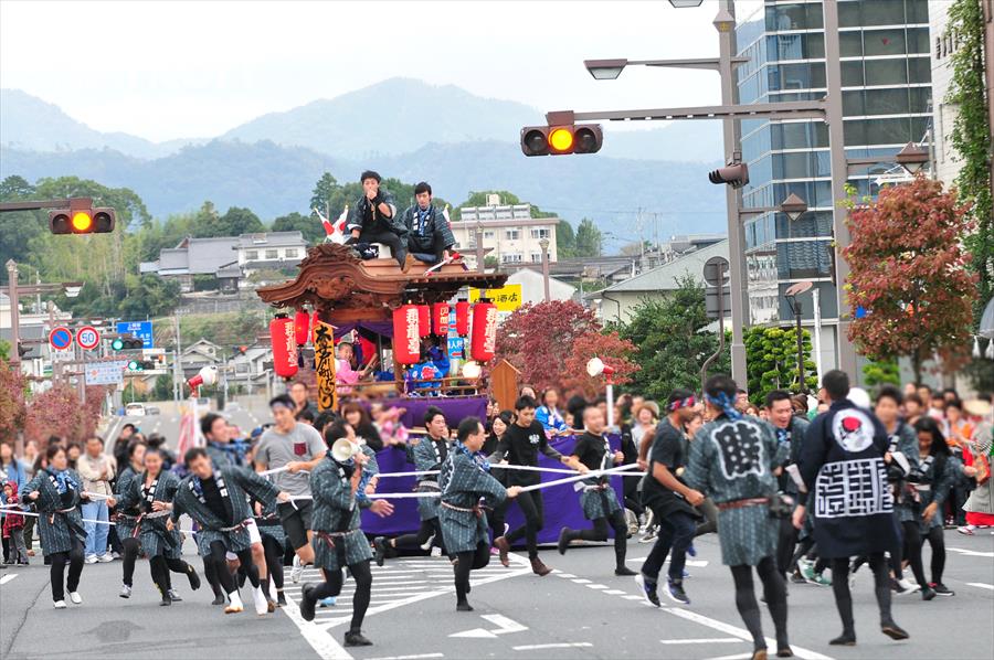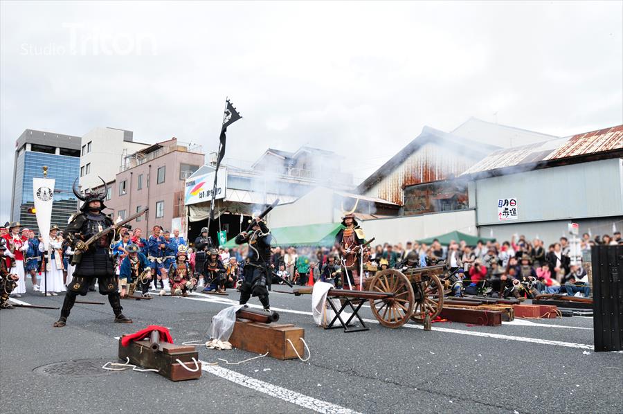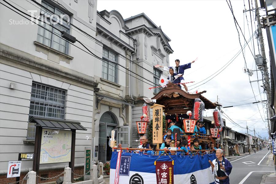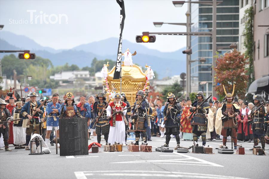 「津山まつり」最終日となる23日、津山総鎮守・徳守神社(津山市宮脇町)の秋祭りが行われ、県重要有形民俗文化財だんじりを含む計12台のだんじりが市街地を勇壮に巡行した。今年は津山城完成400年を記念して、催し会場の奴通りにて「津山総祓神事」を執り行い、津山城鉄砲隊・備州岡山城鉄砲隊による火縄銃の発砲演武に大勢の見物客から拍手と歓声が上がった。(2014年10月26日)