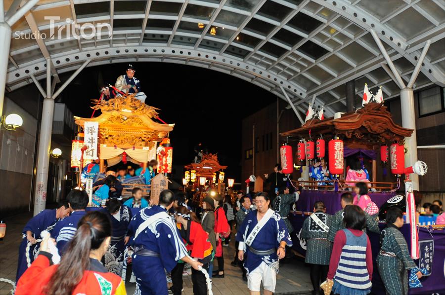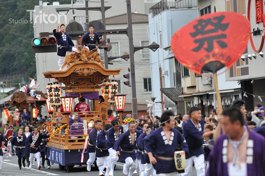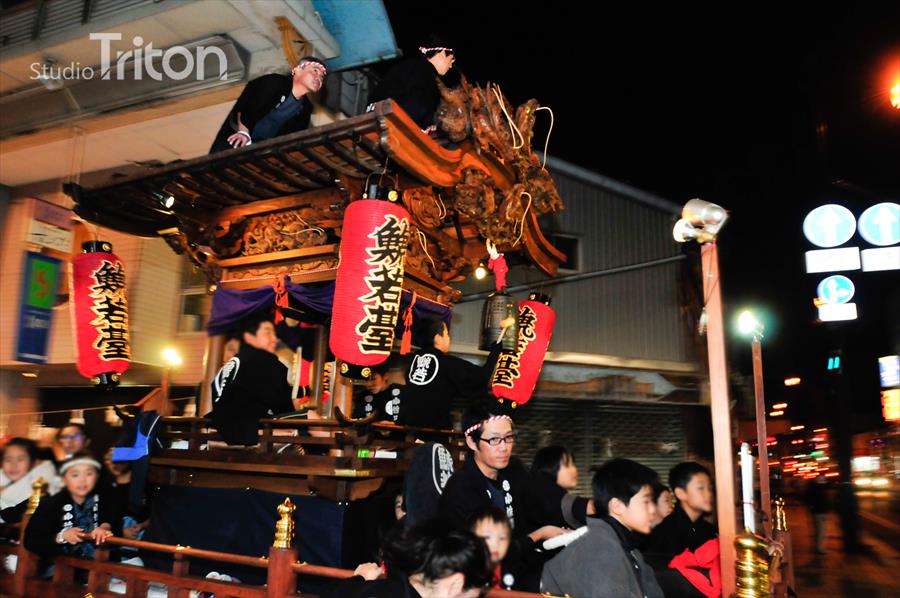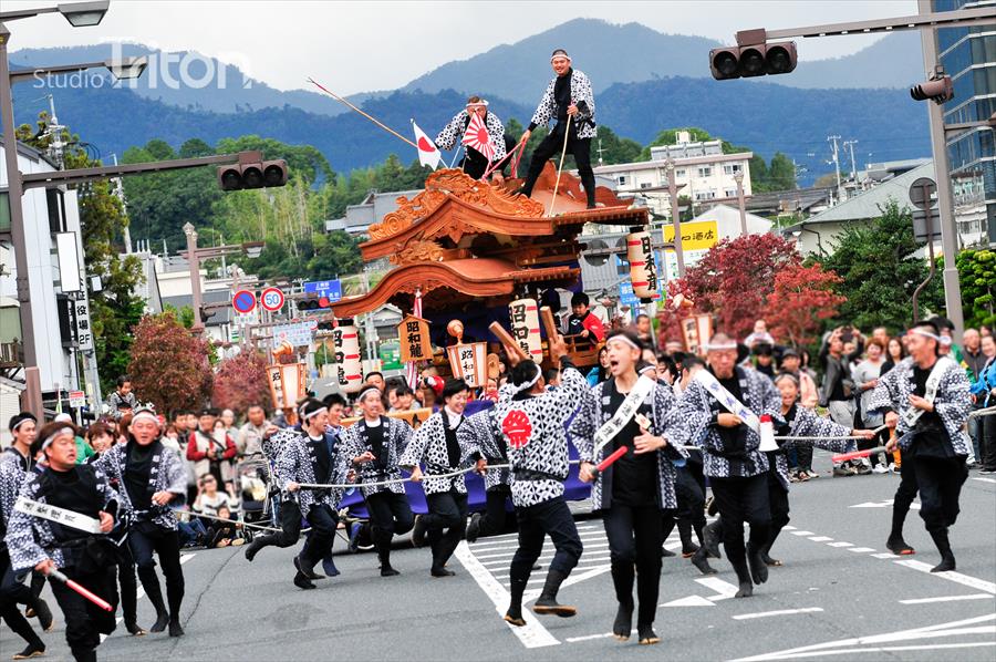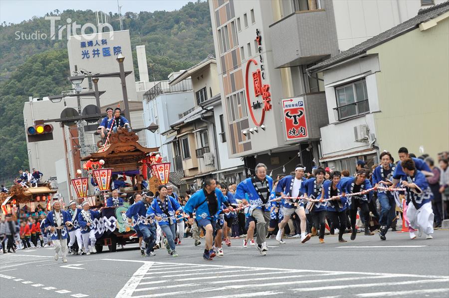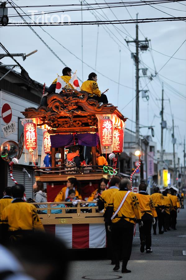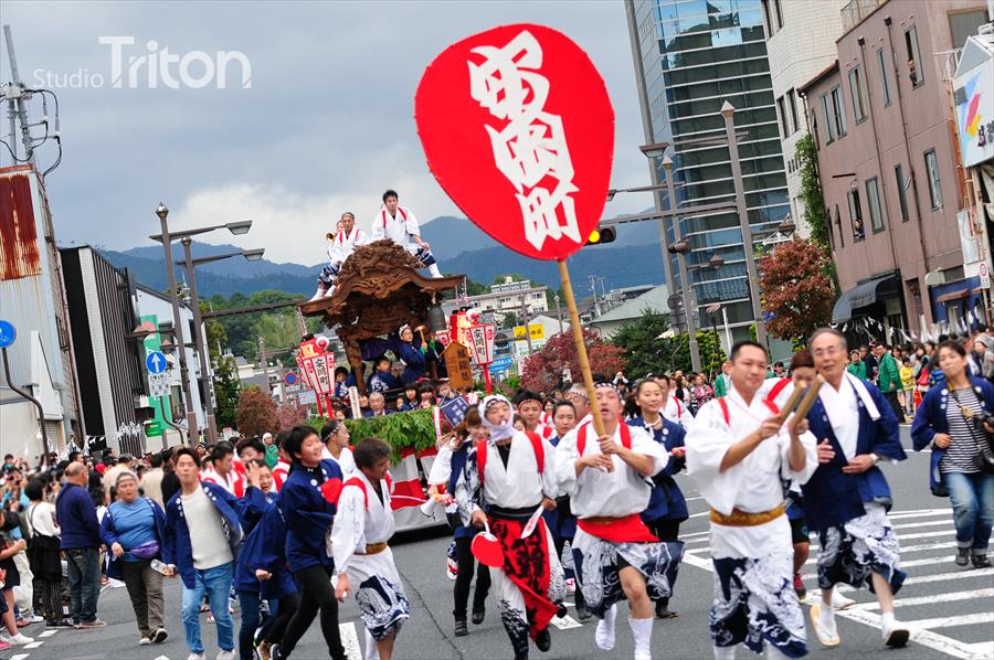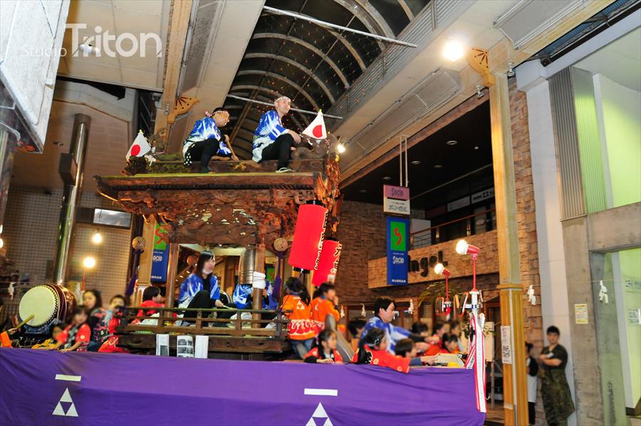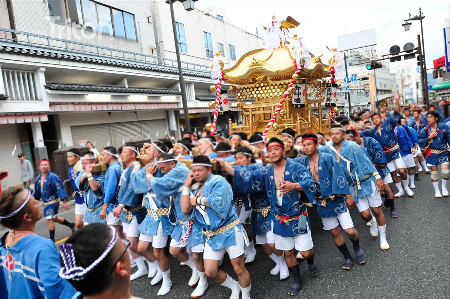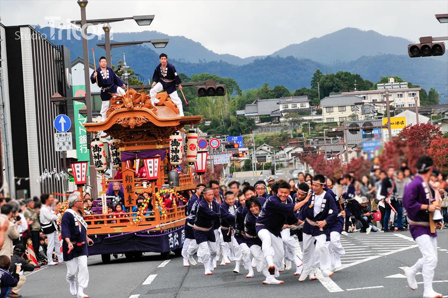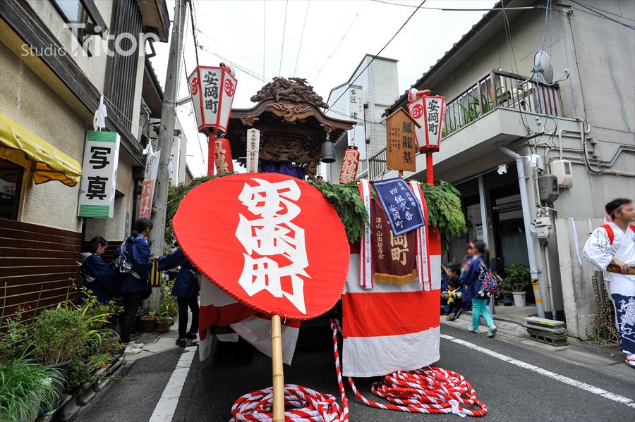 「津山まつり」最終日となる23日、津山総鎮守・徳守神社(津山市宮脇町)の秋祭りが行われ、県重要有形民俗文化財だんじりを含む計12台のだんじりが市街地を勇壮に巡行した。今年は津山城完成400年を記念して、催し会場の奴通りにて「津山総祓神事」を執り行い、津山城鉄砲隊・備州岡山城鉄砲隊による火縄銃の発砲演武に大勢の見物客から拍手と歓声が上がった。(2014年10月26日)