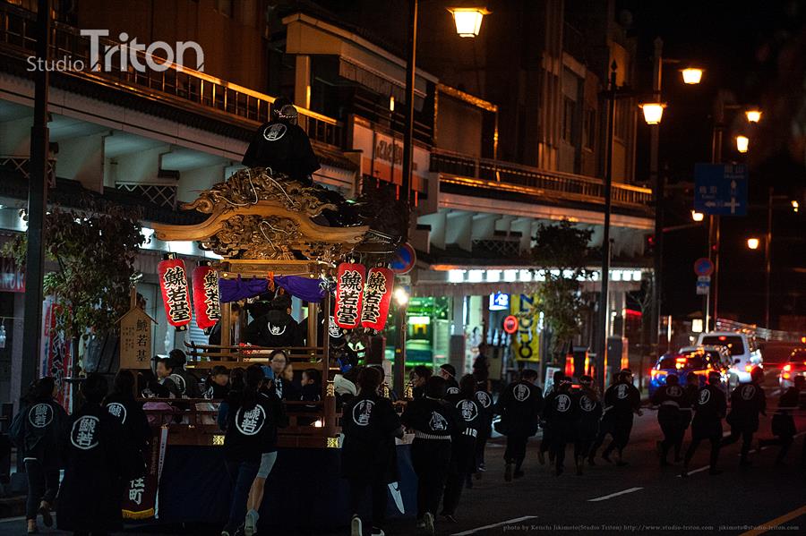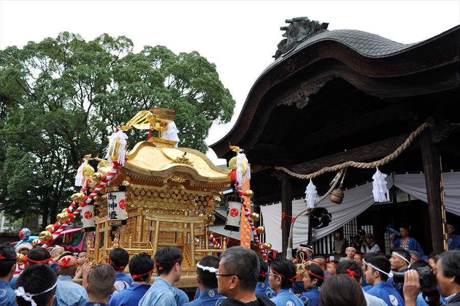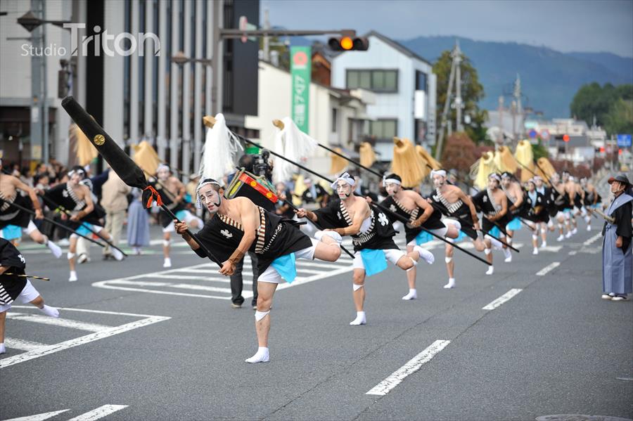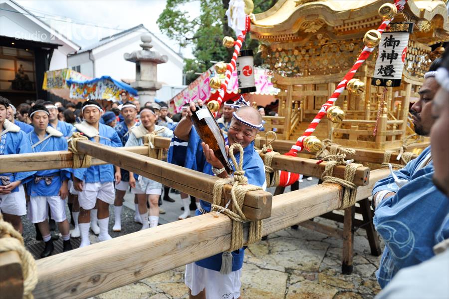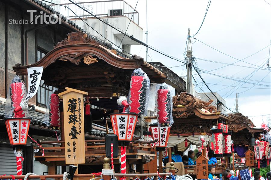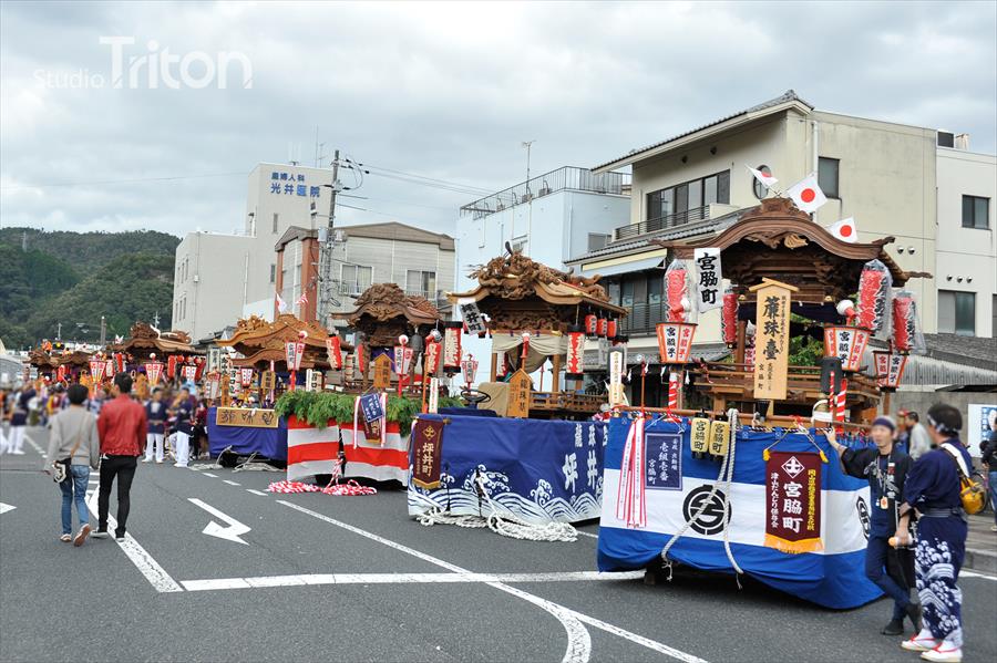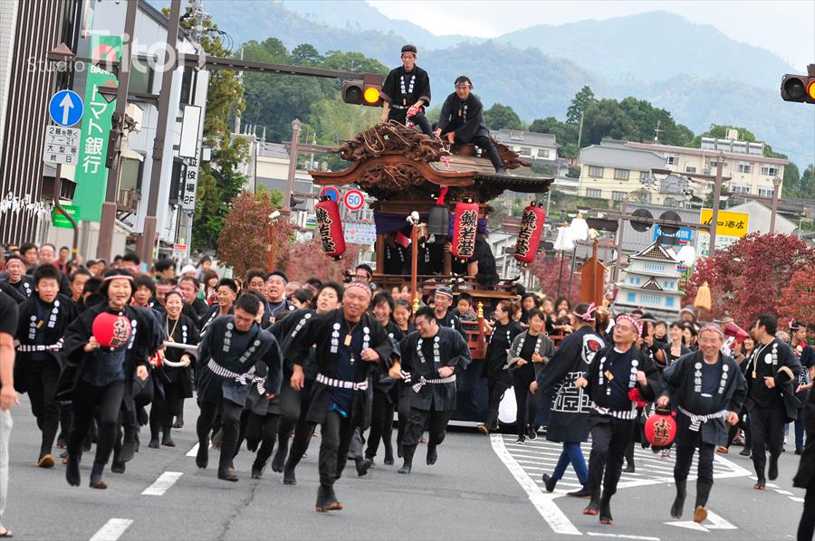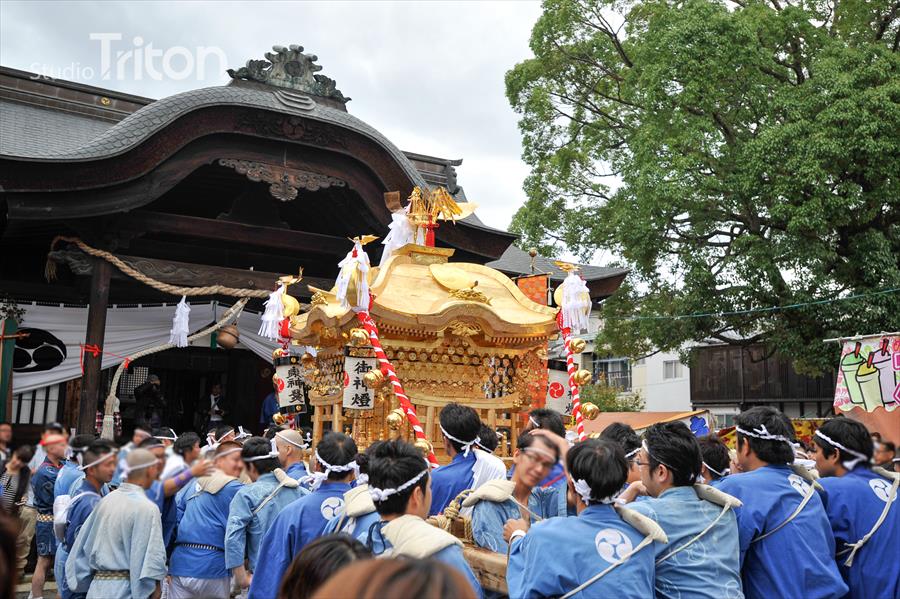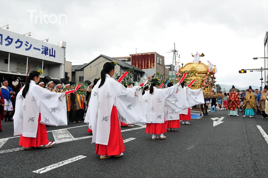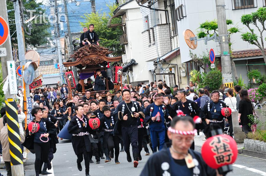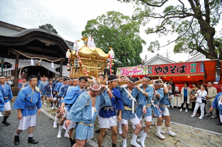 「津山まつり」最終日となる23日、津山総鎮守・徳守神社(津山市宮脇町)の秋祭りが行われ、県重要有形民俗文化財だんじりを含む計12台のだんじりが市街地を勇壮に巡行した。今年は津山城完成400年を記念して、催し会場の奴通りにて「津山総祓神事」を執り行い、津山城鉄砲隊・備州岡山城鉄砲隊による火縄銃の発砲演武に大勢の見物客から拍手と歓声が上がった。(2014年10月26日)