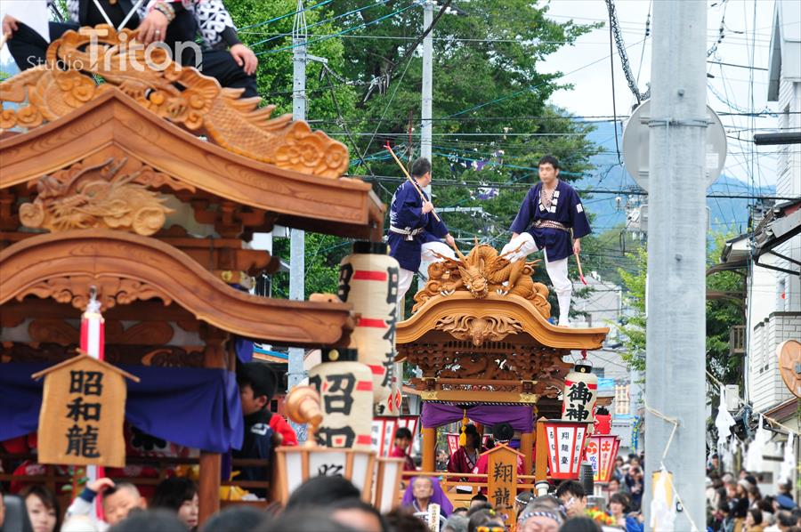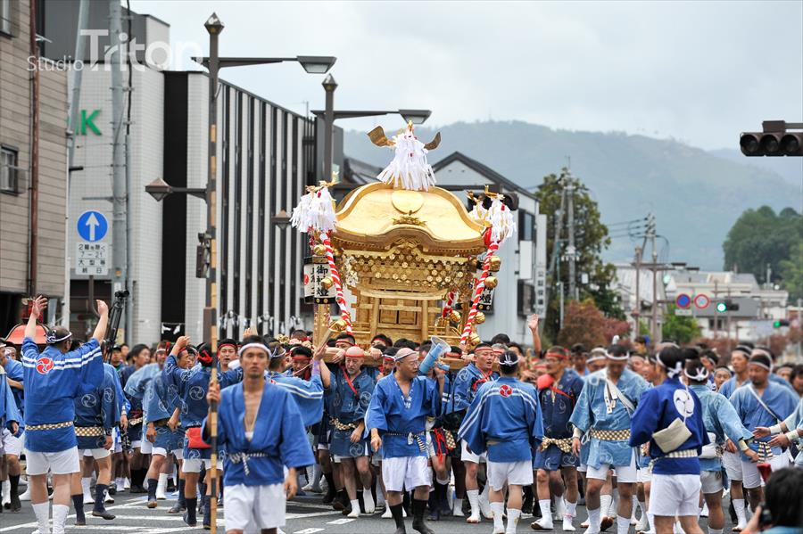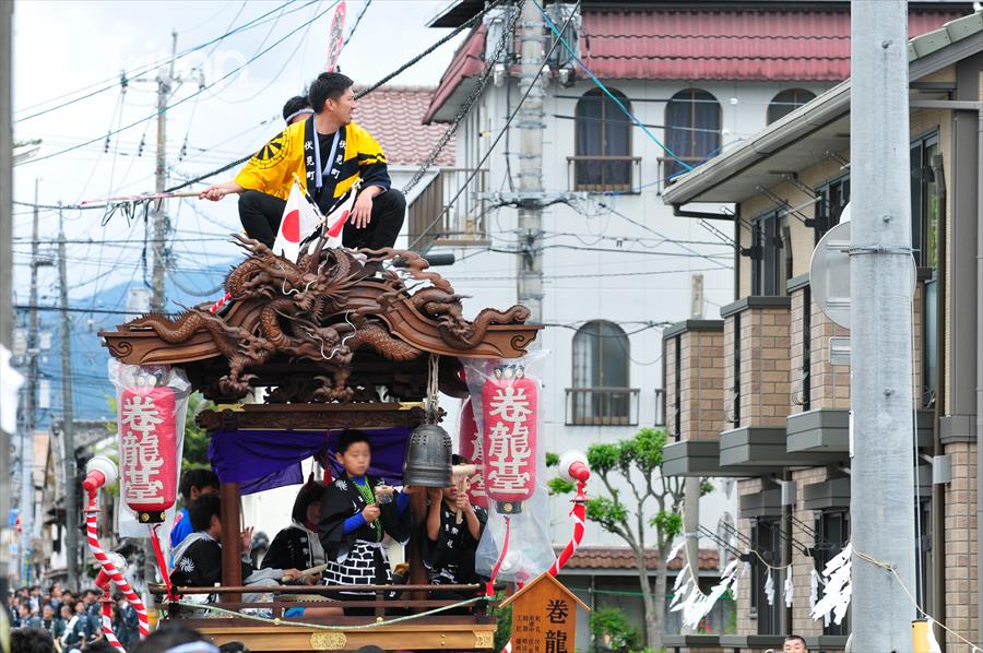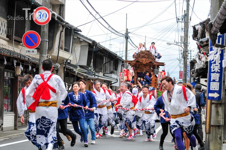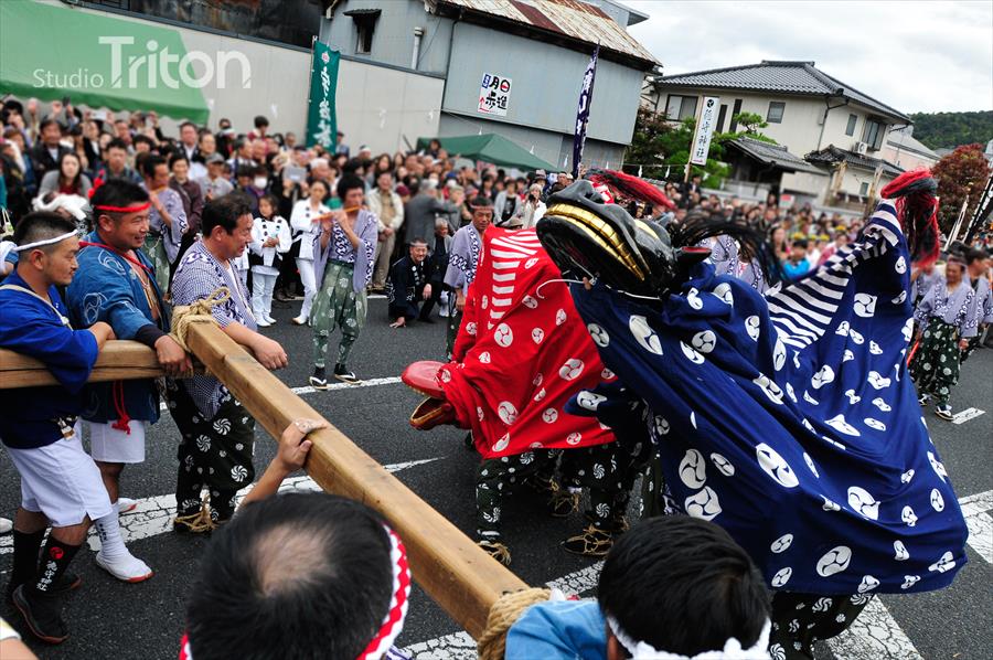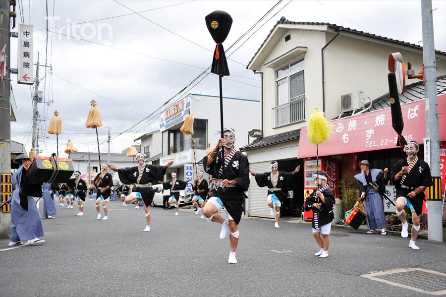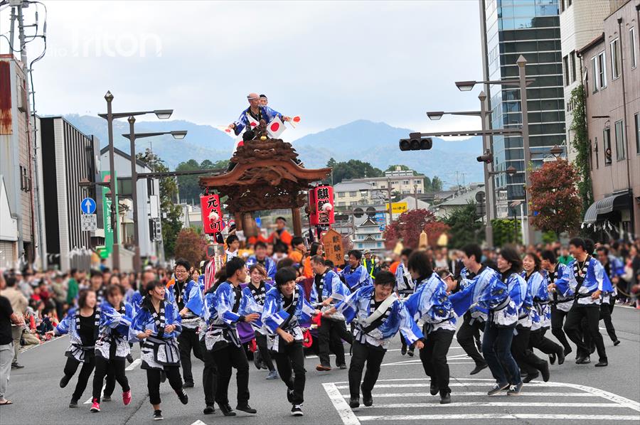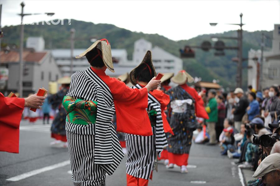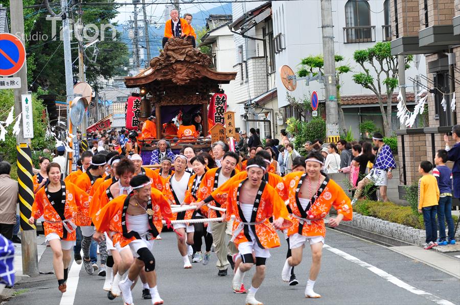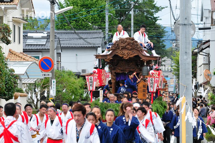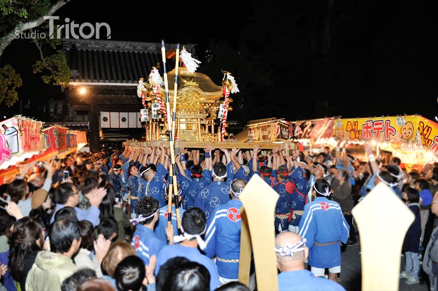 「津山まつり」最終日となる23日、津山総鎮守・徳守神社(津山市宮脇町)の秋祭りが行われ、県重要有形民俗文化財だんじりを含む計12台のだんじりが市街地を勇壮に巡行した。今年は津山城完成400年を記念して、催し会場の奴通りにて「津山総祓神事」を執り行い、津山城鉄砲隊・備州岡山城鉄砲隊による火縄銃の発砲演武に大勢の見物客から拍手と歓声が上がった。(2014年10月26日)
